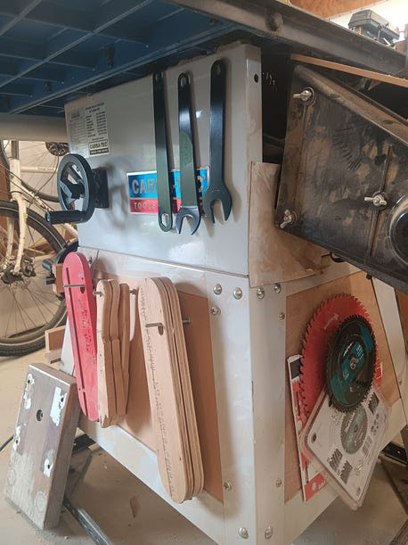 In response to Issue #200’s tips on garbage cans and storing supplies as close to the tool as possible, reader Owen Sinclair sent the above two photos. “Keeping my workshop rubbish bin on a stool is surprisingly easier on my back and frees up a little space.” The second pic shows how Owen keeps relevant tools and supplies right on his table saw.
