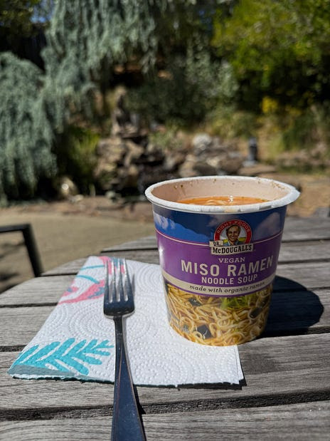 Ramen noodles are often a punchline in jokes about poor college students, singles eating over the sink, and starving artists. It may sound a little corny to admit, but for me, they’ve become a daily restorative ritual that I’ve come to rely on. Every day for lunch, I microwave a cup of Dr. McDougal’s Vegan Miso Ramen Noodle Soup. I take it out to the back patio and sit quietly in front of our little pond waterfall and savor this simple bowl of noodle soup while soaking in the soothing sights and sounds. I’m not vegan, but I did a pretty wide test of other ramen brands and Dr. McDougal’s was, by far, the best tasting and lowest in sodium. The broth is amazing; the whole experience is relaxing and satisfying…to the point where I’m a little sad every time it’s over. In the middle of a hectic, mentally-taxing work day, I’m amazed at how helpful this little lunch break is. For a little extra depth of flavor, I add a splash of low-sodium soy sauce and a squirt of Sriracha.
