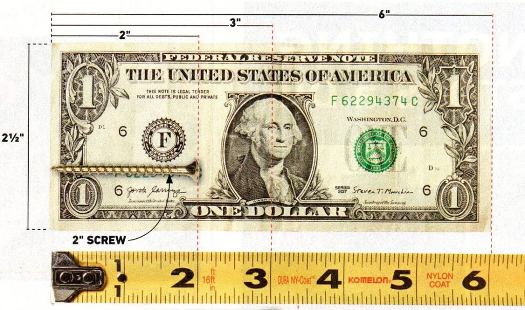 I found this image while cleaning up my office recently. I think it’s from Family Handyman. It shows how you can use points on a dollar to measure 2”, 2-1/2”, 3”, and 6”. Handy in a pinch. I’ve written before about knowing the measurements of your hand (width, length of fingers, between joints) and eyeballing teaspoon, tablespoon, and cup measures in the palm of your hand. Now you can add the measures of George to your impromptu ruling.