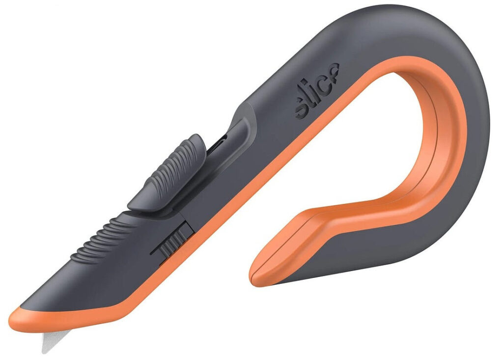 And, as mentioned, they’re great for cutting open that thick plastic clamshell packaging. It’s a lot safer than a pair of scissors. You aren’t going to cut the produce inside. You just run the blade along the fold, and bend it open.The other one is their manual box cutter.