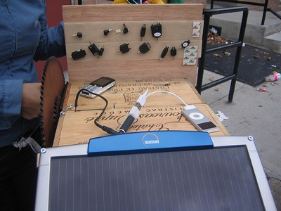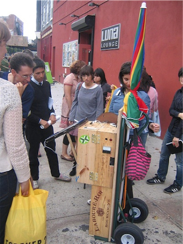 This prototype of a prototypical street cart is artist Mouna Andraos’ idea. From the artist’s proposal: “An old idea from yesterday’s streets adapted to serve the needs of today’s urban dwellers, the Power Cart is a mobile unit that delivers alternative power to people in the streets. Street vendors have traditionally played an important role in defining the urban environment and often speak to the current social and cultural context of a city. In most parts of the world (and if the weather permits it), the street is a place where social interactions abound and where commerce rules, and street vendors around the globe bring to local populations the things they need right at their door steps. Knife sharpening in India, refills of gas in Africa, fake Gucci bags in Paris and chair massages in New York, the Power Cart looks and feels like another service for the city of today. Need a charge on your cell phone? Your laptop is about to die and you really need to check that email? Or maybe there is no power around you at all? Where ever you might be in the world, hail the Power Cart for a quick fix. Let the Power Cart owner turn the crank for you and get the electricity you need, one minute of cranking at a time.”