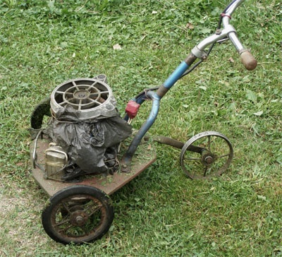 It is apparent that thousands of people who have to mow the lawn decided there must be an easier way and had exactly the same idea: Why not hook the mower to a bike? And so the bikemower is born in a thousand of garages around the country. Judging from the pictures, they are still in the garages. Most of the pics rounded up by McLaren look as if they were taken at garage sales. I have my doubts that the bike mower is very useful, or easier to use than pushing on your feet.