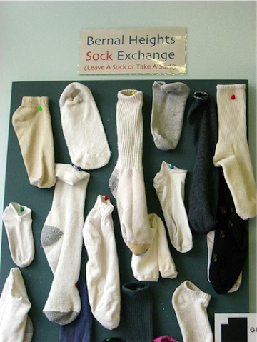 Todd Lapin found this cool “sock exchange” in a San Francisco laundromat (the Bernal Bubbles Laundromat, Cortland Avenue, Bernal