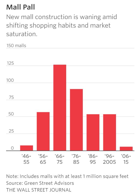 U.S. mall development peaked in the 1970s and has steadily declined. Just six large malls were built between 2006 and 2015, compared with 54 during the previous decade, according to Green Street.