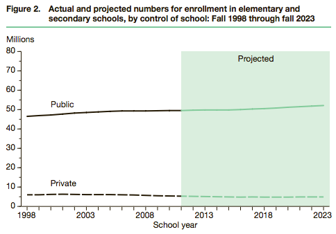 Figure 1: Actual and projected numbers for enrollment in elementary and secondary schools, by control of school: Fall 1998 through fall 2023. (p.5)