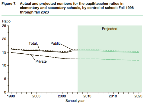 Figure 7: Actual and projected numbers for the pupil/teacher ratios in elementary and secondary schools, by control of school: Fall 1998 through fall 2023 (p.11)