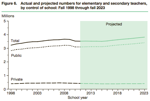 Figure 6: Actual and projected numbers for elementary and secondary teachers, by control of school: Fall 1998 through fall 2023 (p.10)
