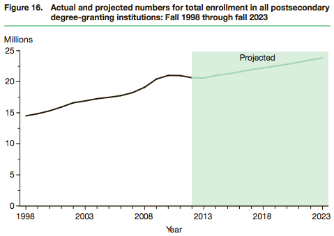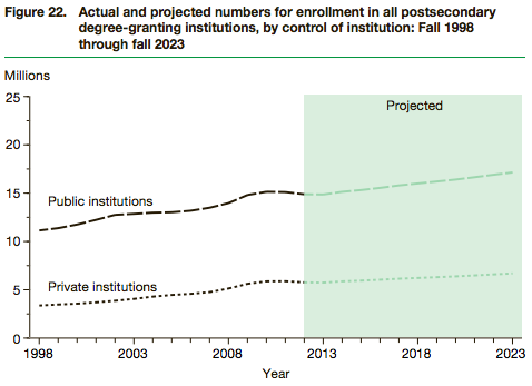 Figure 22: Actual and projected numbers for enrollment in all postsecondary degree-granting institutions, by control of institution: Fall 1998 through fall 2023 (p.27).