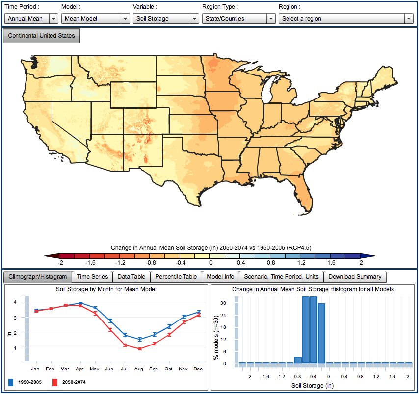 The NCCV allows the user to visualize projected changes in climate (maximum and minimum air temperature and precipitation) and the water balance (snow water equivalent, runoff, soil water storage and evaporative deficit) for any state, county and USGS Hydrologic Unit (HUC).