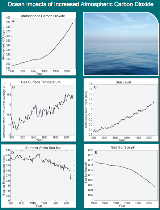 As heat-trapping gases, primarily carbon dioxide (CO2) (panel A), have increased over the past decades, not only has air temperature increased worldwide, but so has the ocean surface temperature (panel B). The increased ocean temperature, combined with melting of glaciers and ice sheets on land, is leading to higher sea levels (panel C). Increased air and ocean temperatures are also causing the continued, dramatic decline in Arctic sea ice during the summer (panel D). Additionally, the ocean is becoming more acidic as increased atmospheric CO2 dissolves into it (panel E). (CO2 data from Etheridge 2010, Tans and Keeling 2012, and NOAA NCDC 2012; SST data from NOAA NCDC 2012 and Smith et al. 2008; Sea level data from CSIRO 2012 and Church and White 2011; Sea ice data from University of Illinois 2012; pH data from Doney et al. 2012 (4,5)).