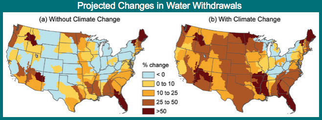 The effects of climate change, primarily associated with increasing temperatures and potential evapotranspiration, are projected to significantly increase water demand across most of the United States. Maps show percent change from 2005 to 2060 in projected demand for water assuming (a) change in population and socioeconomic conditions consistent with the A1B emissions scenario (increasing emissions through the middle of this century, with gradual reductions thereafter), but with no change in climate, and (b) combined changes in population, socioeconomic conditions, and climate according to the A1B emissions scenario. (Figure source: Brown et al. 2013 (4).)
