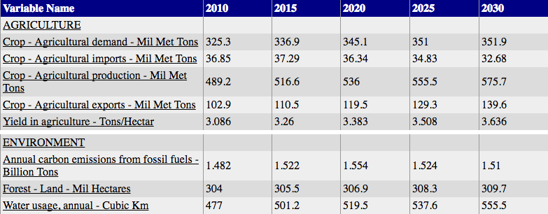 International Futures is a forecasting platform developed by Barry Hughes, based at the Pardee Center at the University of Denver. Among its many forecasts are a small set of agriculture and environment indicators.