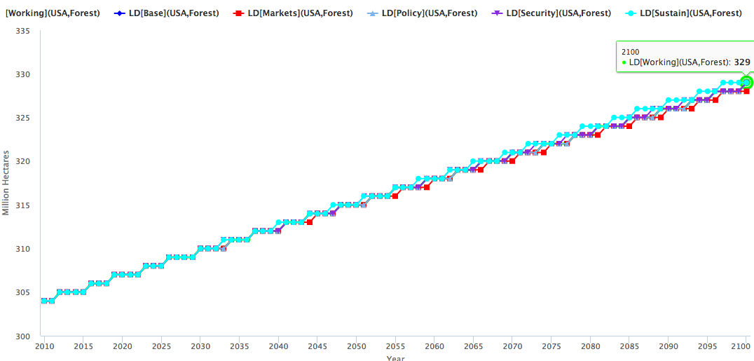 Forecast data through 2100 is available at the site for each indicator, if you click through. For example, here’s the chart for millions of hectares of forest land through 2100: