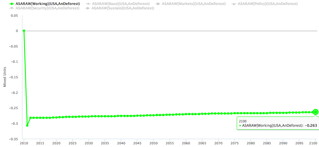 Raw annual deforestation (million hectares), 2010-2100 (via the Advanced Sustainability Analysis table):