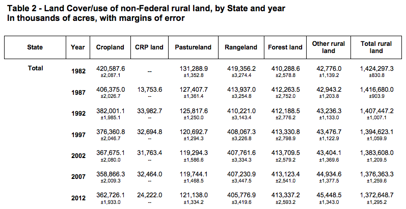The USDA’s National Resources Conservation Service (NRCS) has published a periodic National Resources Inventory (NRI) since 1977, with data being collected annually since 2000. The contemporary reports give acreage counts for non-Federal lands, including cropland, Conservation Reserve Program lands, pastureland, rangeland, forest land, and other rural land.