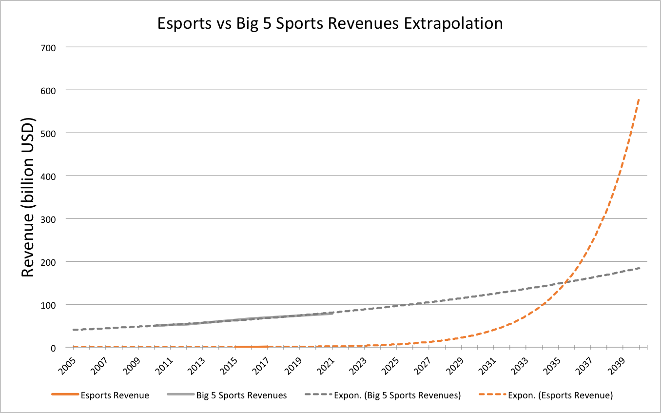 Extrapolate total revenues for esports vs. total revenues for conventional sports