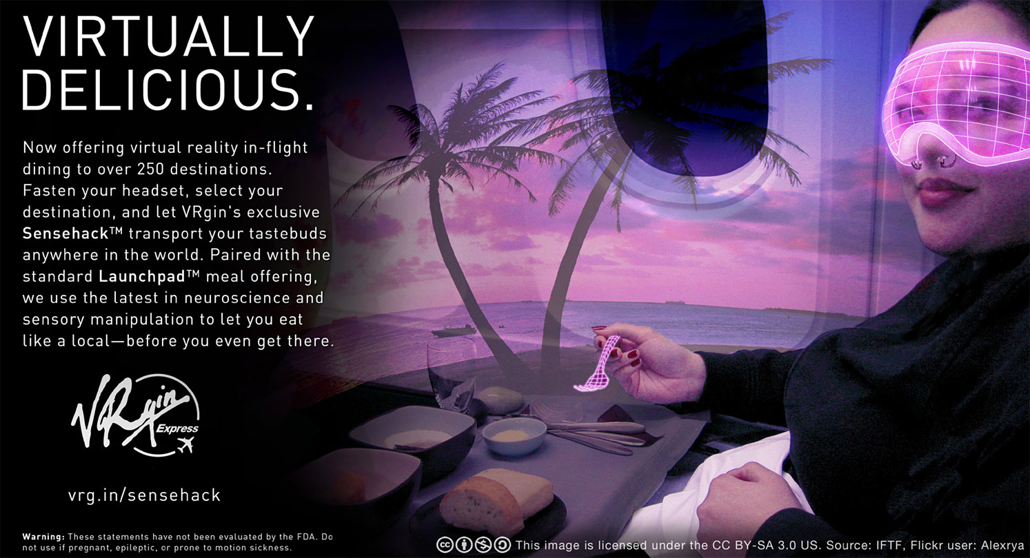The ability to directly and precisely manipulate the human senses will open a new frontier for creating food experiences. Initial attempts to rewire taste will likely be around curbing the hardwired drives for fats and sugars to improve health. However, as we develop a more nuanced understanding of both the chemical and psychological components that make up how we perceive food, people will start hacking the senses for many different goals—maximizing bliss, recreating nostalgic meal experiences, or making healthy, but bland, foods more enjoyable.