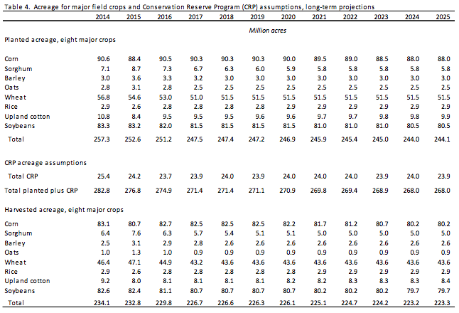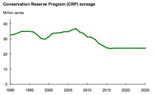 Farm programs of the Agricultural Act of 2014 are assumed to be extended through the projection period. Acreage enrolled in the Conservation Reserve Program (CRP) is assumed at levels slightly below the legislated maximum of 24 million acres.