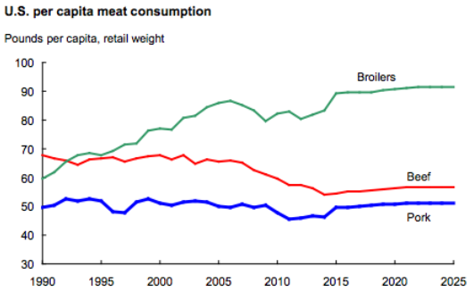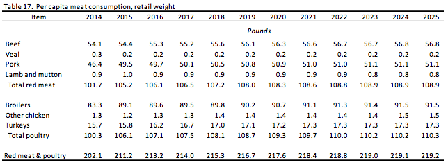 As production increases, consumption of red meats and poultry is projected to rise from about 211 pounds per person in 2015 to about 219 pounds toward the end of the projection period. Although this level consumption is below those in 2004-07 of more than 221 pounds per person, it represents a rebound from a low of 202 pounds per person in 2014.