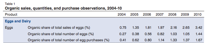 Nielsen Homescan data is an annual, nationally representative panel of households’ retail food purchases. USDA organic food certification began in 2002, and Nielsen started tracking whether a product was organic in 2004. USDA’s Economic Research Service conducted a study using the Nielsen data from 2004 through 2010 to compare sales data over the period. Each product tracked was ranked by percent of organic sales, percent of organic purchase quantity, and percent of organic transactions (Table 1).