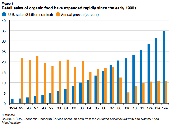 Organic Food Sales, 1994-2014; 2006-2015, USDA; Organic Trade Association (OTA)