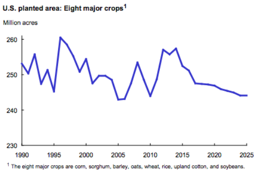 Over the long run, steady global economic growth provides a foundation for increasing crop demand, with gains in world consumption and trade. Although crop prices are projected to be below recent records, they remain above pre-2007 levels. U.S. plantings for the eight major crops continue to fall during the second half of the projection period, to about 244 million acres by 2025. Corn and soybeans decrease the most. Increasing yields provide most of the gains in U.S. production.