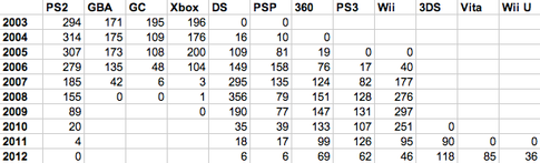 Note: This database includes substantially more titles than were reflected in the Quora answer below (in which data was gathered by hand from a variety of Wikipedia pages). I believe the MobyGames data to be more accurate.