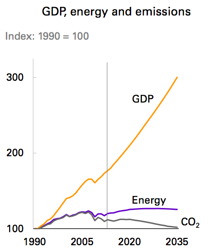 Continuing declines in energy intensity – the broadest indicator of improving energy efficiency across the economy – leads to a marked widening in the gap between GDP and energy consumption. Energy intensity declines by 39% by 2035 (-2.2% p.a.). Total carbon emissions from energy consumption decrease by 9% between 2013 and 2035 (-0.4% p.a.), with the rate of decline speeding up in the last half of the outlook, (-0.7% p.a. from 2025 to 2035).