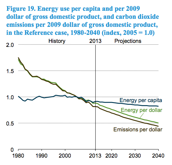 Energy intensity (measured both by energy use per capita and by energy use per dollar of GDP) declines in the AEO2015 Reference case over the projection period (Figure 19).