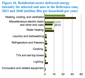 End-use energy intensity, as measured by consumption per residential household or square foot of commercial floorspace, decreases in the Reference case as a result of increases in the efficiency of equipment for many end uses (Figure 16 and Figure 17). Federal standards and voluntary market transformation programs (e.g., Energy Star) target uses such as space heating and cooling, water heating, lighting, and refrigeration, as well as devices that are rapidly proliferating, such as set-top boxes and external power supplies.