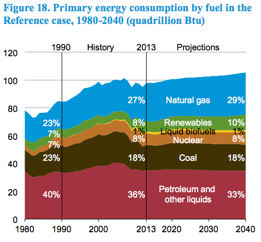 The U.S. Energy Information Administration (EIA) presents energy forecasts for a range of cases in its Annual Energy Outlook. The excerpts below refer to the Reference Case, wherein GDP grows at an average annual rate of 2.4%, and current laws and regulations remain basically the same. This is the “business as usual” scenario. Forecasts for five other scenarios are presented in the report, but are not excerpted here.
