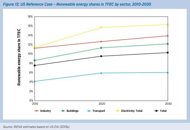 In 2010, the US was the second largest energy consumer in the world with a total final energy consumption (TFEC) of 64 exajoules (EJ), equivalent to 19% of the global TFEC (IEA, 2013a). The US TFEC is projected to remain stable in the period between 2010 and 2030 growing by only 4% according to US Energy Information Agency‘s Annual Energy Outlook (AEO) (US EIA, 2013a). In the same time period, based on current policies or the Reference Case according to this study, the US share of renewable energy in the TFEC will only grow from 7.5% in 2010 to 10% in 2030, driven mostly by an increase in renewable power generation.