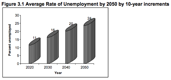 If socio-political-economic systems stay the same around the world, and if technological acceleration, integration, and globalization continue, what percent of the world do you estimate could be unemployed—as we understand being employed today—during each of the following years: 2020; 2030; 2040; 2050?
