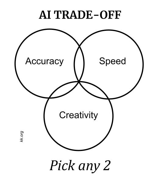AI will improve in accuracy, creativity and speed. Even LLMs. But there seems to be an inherent tradeoff between these attributes, so that you can’t optimize more than two of them at once. To be clear, we will have AIs that will be more accurate, more creative, and faster than the ones we have today, but at any moment, a particular AI will not be able to optimize all three qualities at once.
