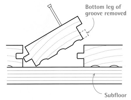 To insert a replacement board into an existing tongue-and-groove floor, use a tablesaw to remove the bottom of the groove. Slightly back-cut the ends of the new board so it will slide in easier.