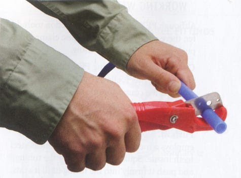 The beauty of working with PEX is that is required relatively few specialized tools. Here, an inexpensive PEX-cutting tool with a replaceable blade produces a clean, squared-off end.