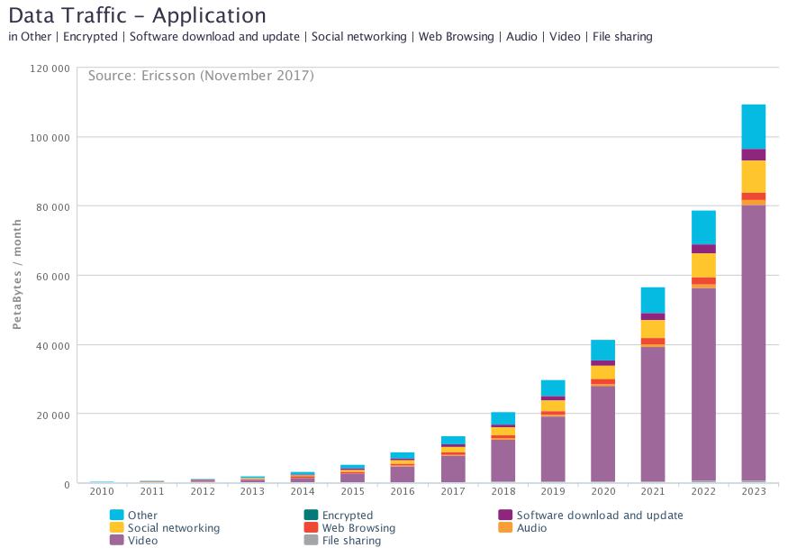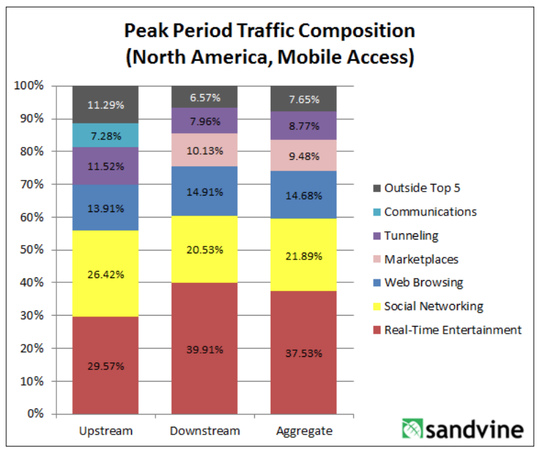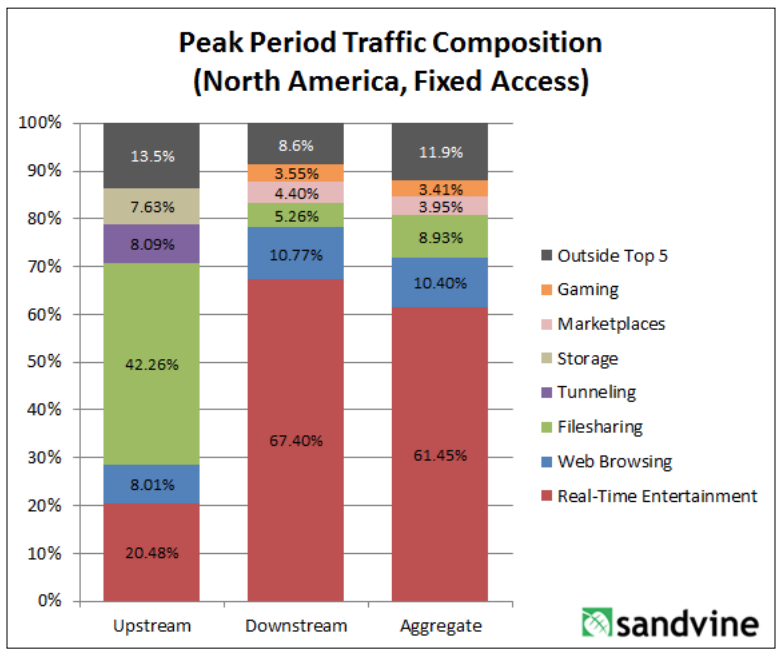 Sandvine, a Canadian network intelligence firm, tracks traffic composition. They’ve published a few reports with the current and previous year’s data, but I haven’t found anything more longitudinal. The reports describe peak period traffic composition across the following categories: real-time entertainment, marketplaces, storage, filesharing, web browsing, gaming, social networking, communications, and other. There are separate charts for mobile and fixed access.
