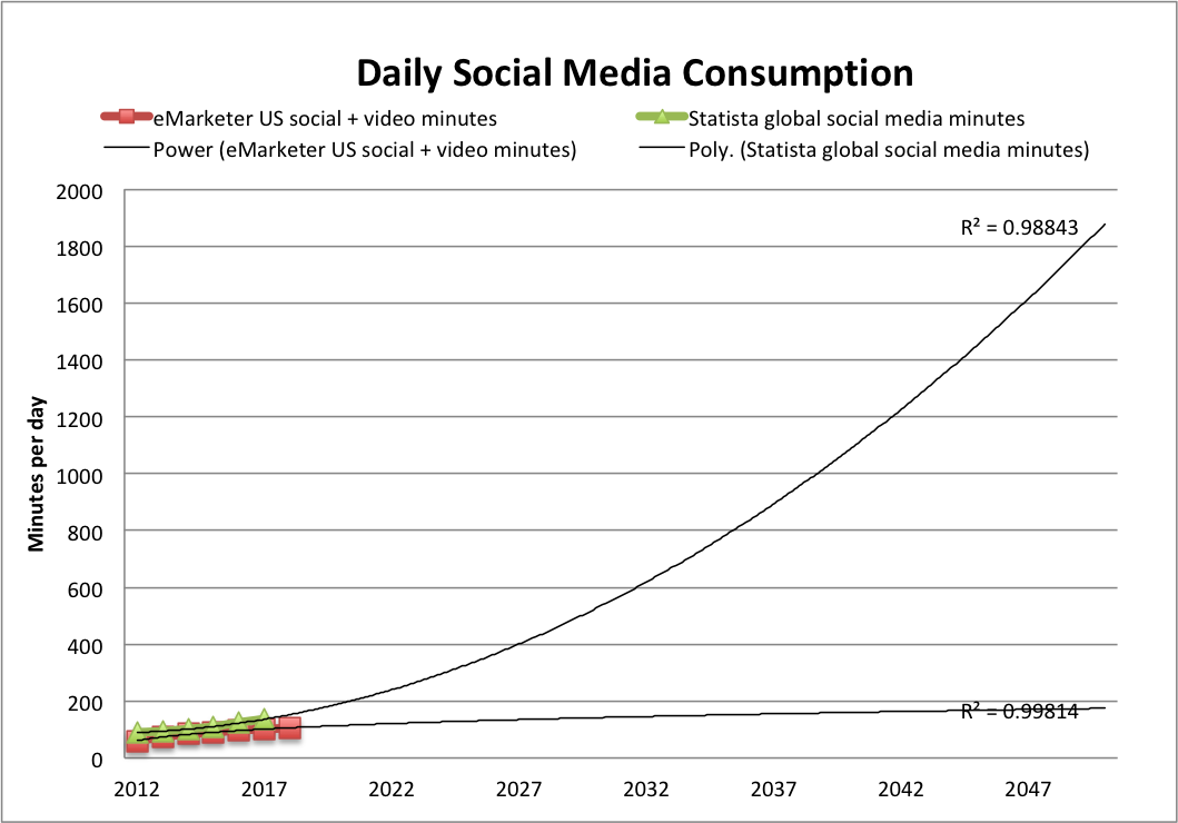 I also noticed in reading qualitative discussions that Facebook and YouTube’s average daily minutes are very similar, with video getting a bit more time, and this is also the shown in eMarketer’s data, with the gap slowly widening in video’s favor. I’ve extrapolated eMarketer’s social and video figures separately to show how that divergence might take shape (again, the power trendline seemed to fit best).