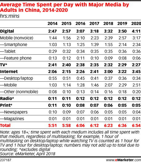 Average time spent per day with major media by adults in China 2014-2020