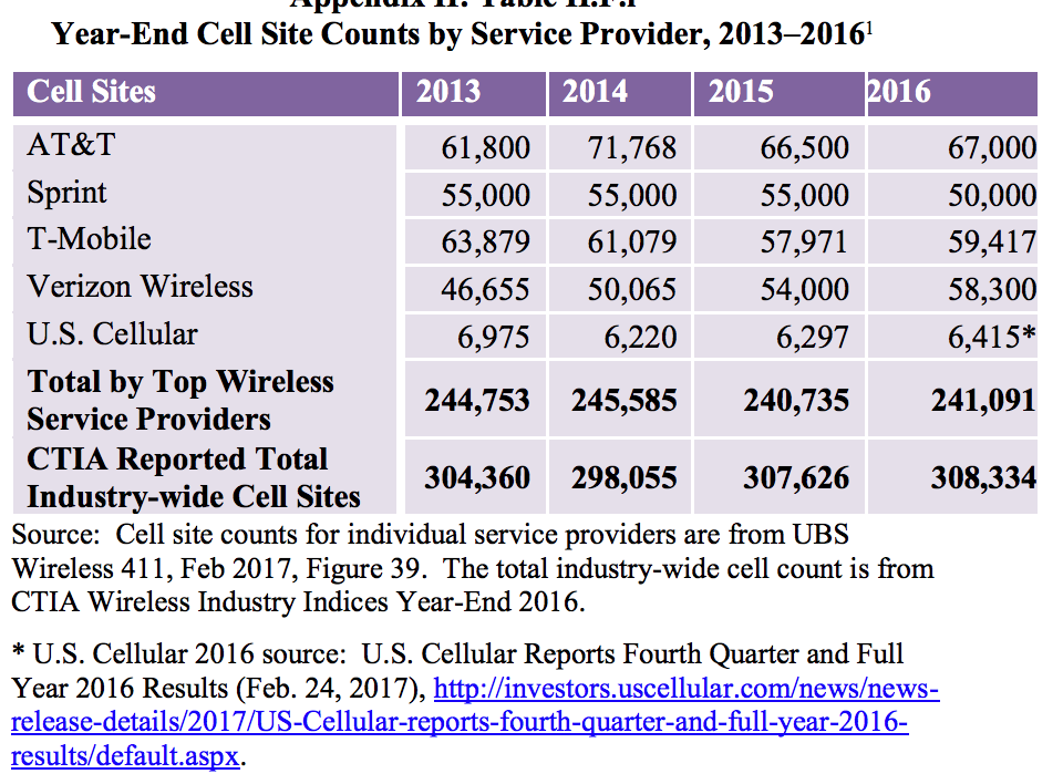 The report notes that, according to CTIA, the number of cell sites will significantly increase as the mobile wireless industry densifies and prepares for 5G. Also, because multiple cell sites can be co-located in the same “tower” site, the reported cell sites should not be equated with “towers.” The reported cell sites include repeaters
