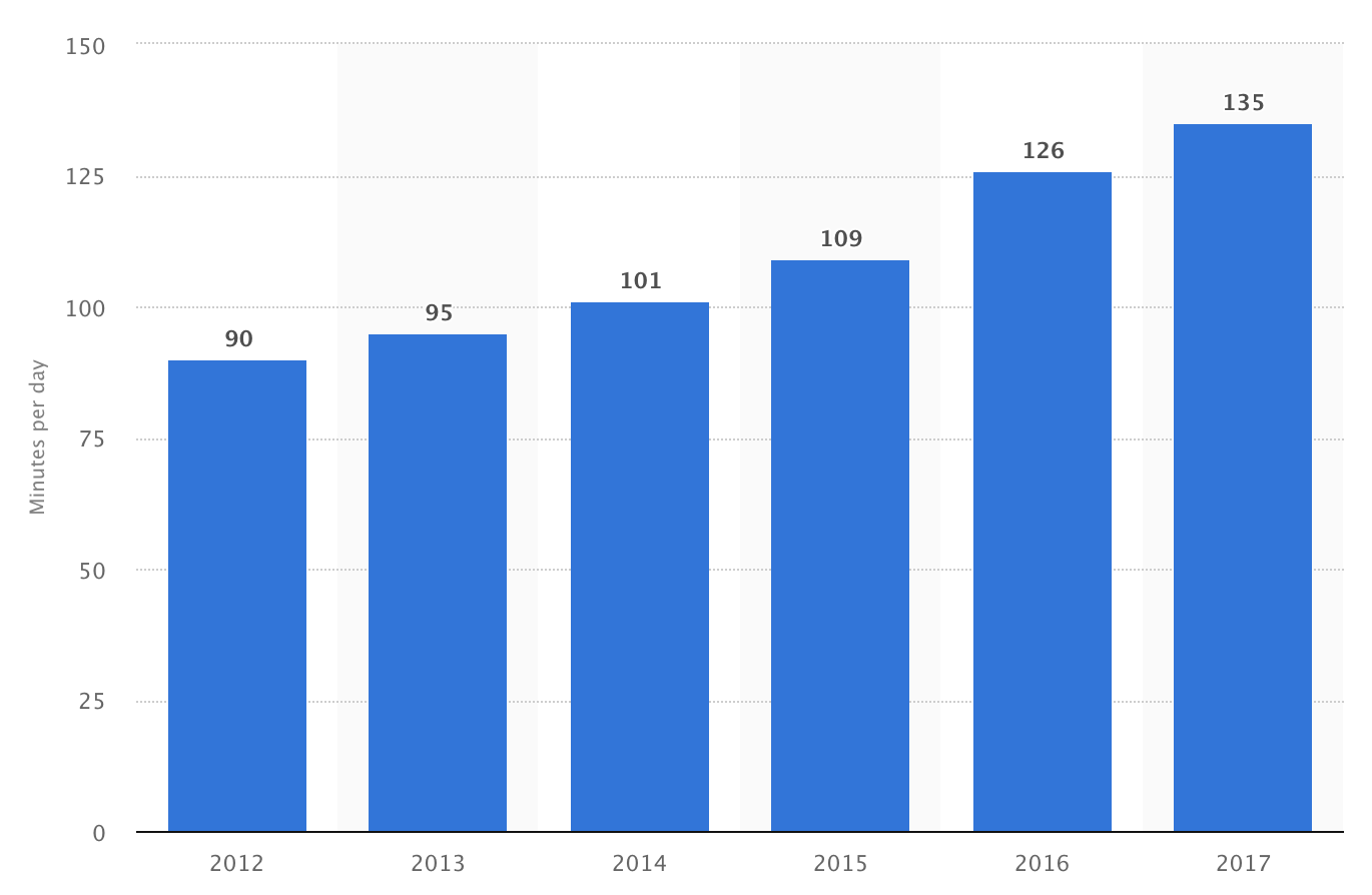 When eMarketer’s social and video minutes are combined, they come in closer range to Statista’s figures, so I believe this is a good rough approximation.