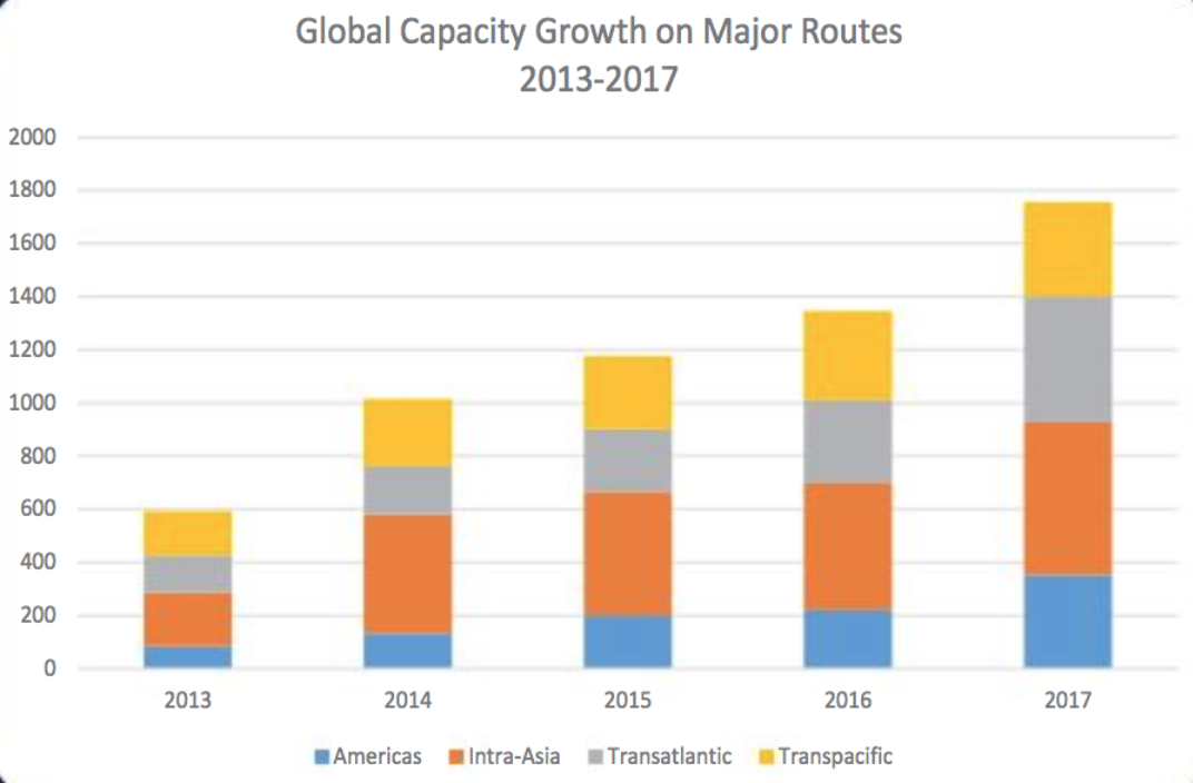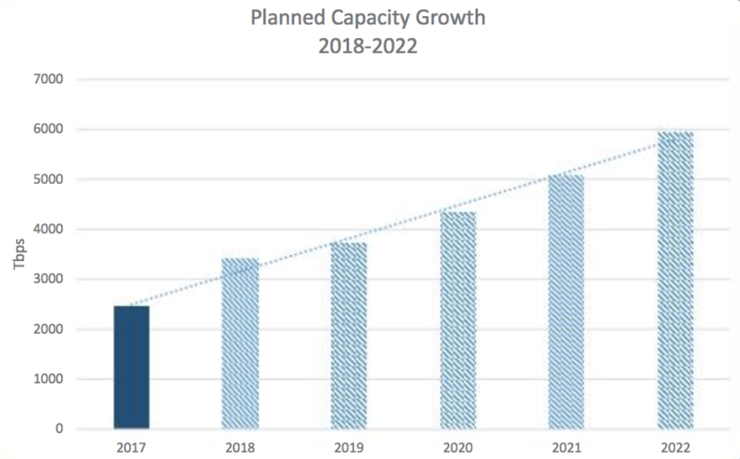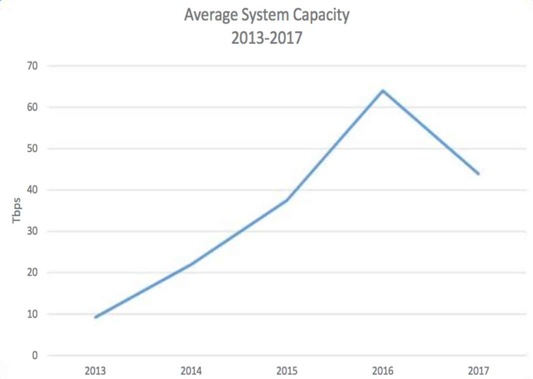 Between 2013 and 2017, the subsea cable industry has added an average of 32 percent of capacity annually on major submarine cable routes.