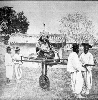 Decoration ran riot in the headgear of officers of the old Korean army, whose service was indeed rather ornamental than military. This melancholy-looking individual, huddled up with the correct air of aristocratic helplessness on his palanquin, is a general officer. The palanquin is fitted with a single wheel which relieves the bearers of something of the weight of so much dignity.