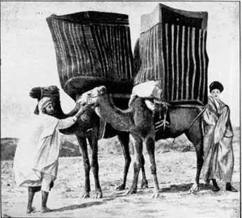 Arab women of the better class travel in palanquins resembling square tents erected on the humps of camels. Gaudy striped cloth is stretched round the framework of the tent, giving an odd cage-like effect to the contrivance viewed from a little distance. When on the move over the desert, servant women walk beside the camels, and men on horseback guard the caravan.