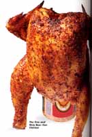 "Bizarre" and "outrageous" aren't necessarily words you expect to find in a cookbook. But how else would you describe roasting a chicken in a vertical position over an open beer can? I first encountered the method at the Memphis in May Barbecue Festival and described it in The Barbecue! Bible. Since then, I've prepared beer-can chicken hundreds of times, and each time this astounding technique produces an exquisite bird. The fact is, the upright position helps drain off the fat, and crisp the skin, while the beer in the can steams and flavors the bird from the inside. Needless to say, the sight of a roasted chicken standing erect on an upright can of beer will astound your guests.