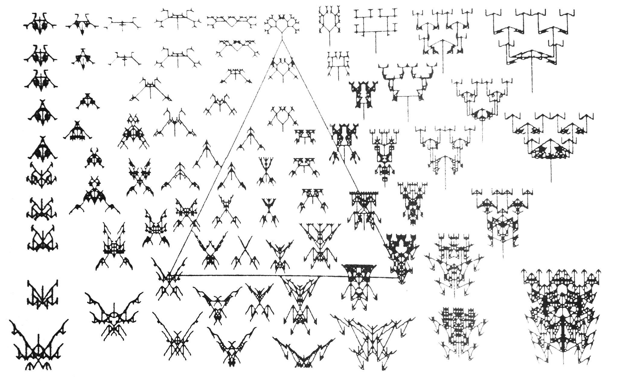 Instead of a single decibel line, a more accurate model for intelligence is to chart its possibility space, like the above rendering of possible forms created by an algorithm written by Richard Dawkins. Intelligence is a combinatorial continuum. Multiple nodes, each node a continuum, create complexes of high diversity in high dimensions. Some intelligences may be very complex, with many sub-nodes of thinking. Others may be simpler but more extreme, off in a corner of the space. These complexes we call intelligences might be thought of as symphonies comprising many types of instruments. They vary not only in loudness, but also in pitch, melody, color, tempo, and so on. We could think of them as ecosystem. And in that sense, the different component nodes of thinking are co-dependent, and co-created.