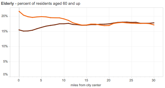 elderly by proximity to center, 1990/2012, UVA