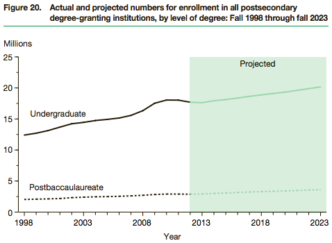 Figure 20: Actual and projected numbers for enrollment in all postsecondary degree-granting institutions, by level of degree: Fall 1998 through fall 2023 (p.26)