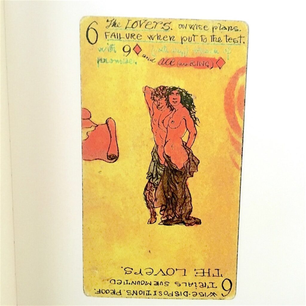 The always-impressive booksmiths at Strange Attractor Press have delivered on all of that in spades with their publication of Lost Envoy: The Tarot Deck of Austin Osman Spare. This absolutely gorgeous hardbound tome meticulously reproduces the cards, front and reverse, along with a concordance of all of the textual data found on the cards (which is quite heavy on some). The book also includes a very satisfying collection of essays by Magic Circle Museum curator and book editor Jonathan Allen, Spare biographer Phil Baker, artist and author Alan Moore, tarot academic Helen Farley, Spare historian and publisher Gavin Semple, and others. There is also an essay by Spare himself, “Mind to Mind and How by a Sorcerer.” Through these essays, we learn about fascinating differences in Spare’s deck, like his use of images and words that bridge individual cards (not found in other deck designs), how conventional playing cards and the culture of stage magic played a bigger role in his deck, and which historical tarot decks (and other occult currents) informed his stylistic and symbolic choices.