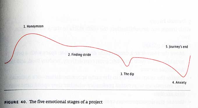 Small things start to niggle. Compromises that were fine earlier on in the project now start to grind. Homes, families, and things that provide comfort are missed. The team has an awareness of the deliverable deadline, but it’s not yet clear whether they’ll get there. The dip is exacerbated when the client is in-field: a lot of money has been spent but there’s little recognisable return on investment. Without clear direction, a leadership vacuum can turn the dip into a major depression. During this phase: